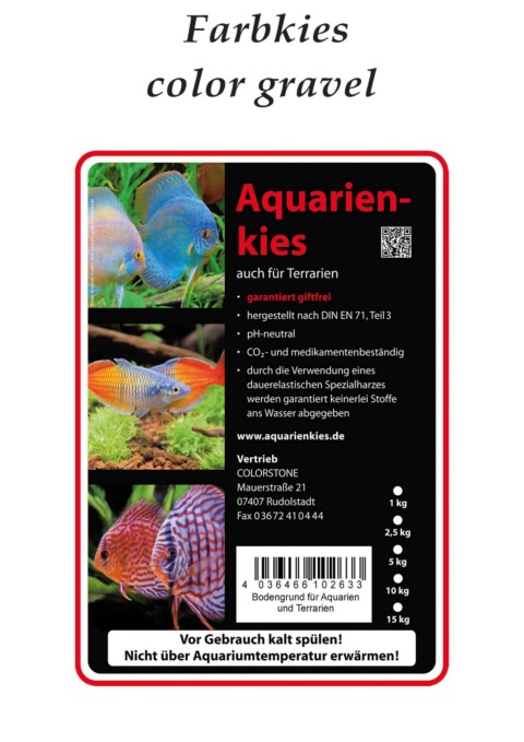 Farbkies color gravel 111111111111111111111111111111 4 036466 102633 Bodengrund für Aquarien und Terrarien Vor Gebrauch kalt spülen! Nicht über Aquariumtemperatur erwärmen!